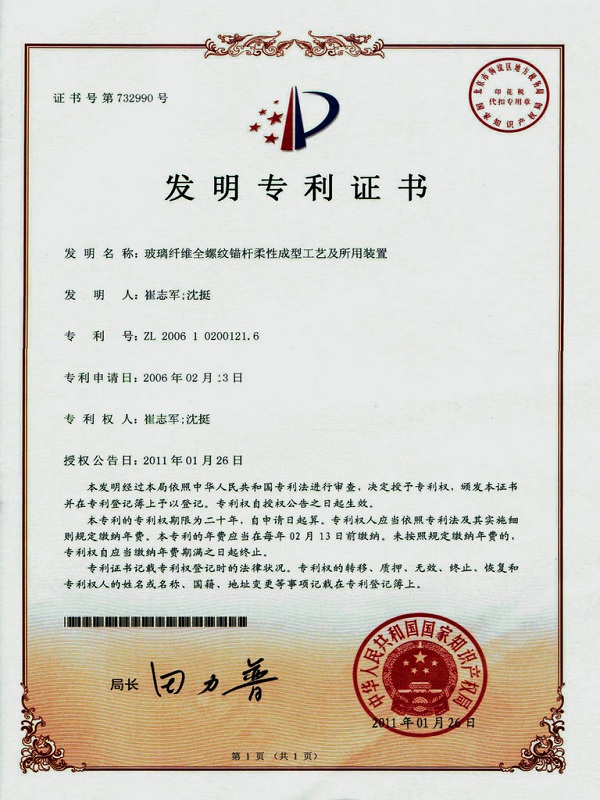 我單位研發(fā)、生產(chǎn)及銷售的具有世界領(lǐng)先水平的全螺紋玻璃鋼錨桿生產(chǎn)線專利號(hào):ZL200610200121.6是全螺紋式樹脂錨桿玻璃纖維增強(qiáng)塑料桿體的專用設(shè)備,經(jīng)過(guò)改進(jìn)的玻璃鋼錨桿生產(chǎn)線亦可以生產(chǎn)玻璃纖維筋、纖維增強(qiáng)復(fù)合材料筋等。